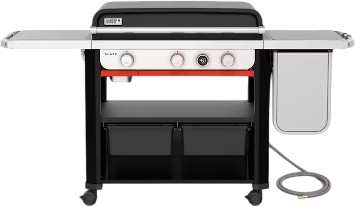 Step up to a premium flat-top grilling experience with the sleek and stylish 30” Slate® Rust-Resistant Griddle. This model comes with premium features, including a digital temperature display, two Weber Works™ outdoor storage bins to keep griddle tools handy and protected from the weather, an extendable side table (right) to expand your prep area, and a fold-down side table (left) to free up space.Read More